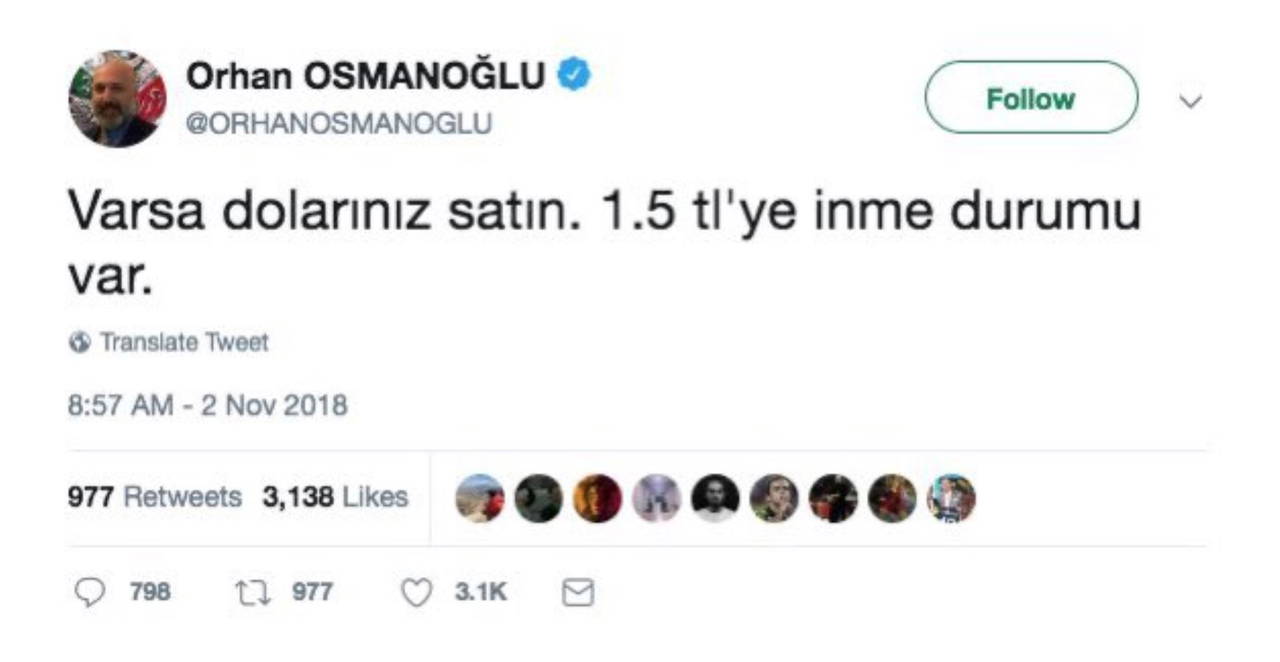 Orhan Osmanoğlu, doların 10 liraya yaklaşmasının ardından 3 yıl önce attığı "dolar" tweetini silmişti.
