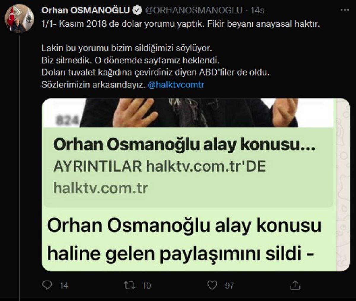 "Kasım 2018 de dolar yorumu yaptık. Fikir beyanı anayasal haktır. Lakin bu yorumu bizim sildiğimizi söylüyor. Biz silmedik. O dönemde sayfamız heklendi. Doları tuvalet kağıdına çevirdiniz diyen ABD'liler de oldu. Sözlerimizin arkasındayız."