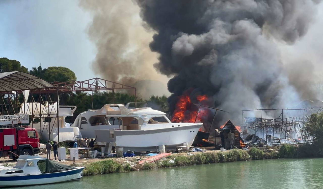 Antalya'da Kundu bölgesinde bulunan Aksu Çayı kenarındaki ormanda çıkan yangın, çayın kenarında bakımı yapılan teknelere sıçradı.