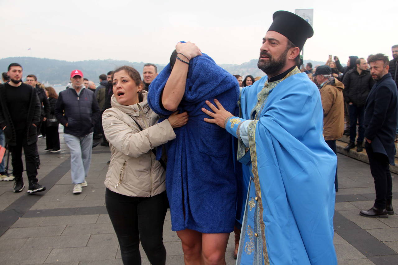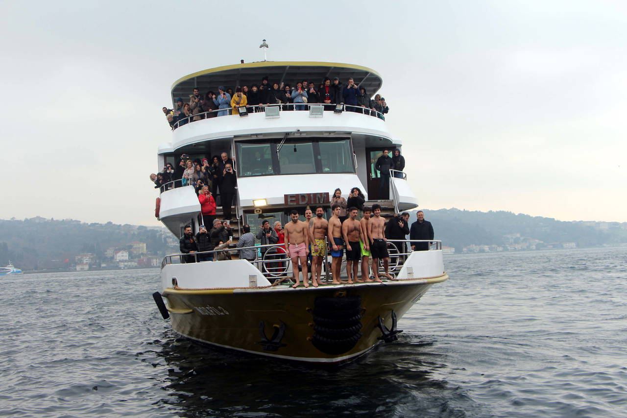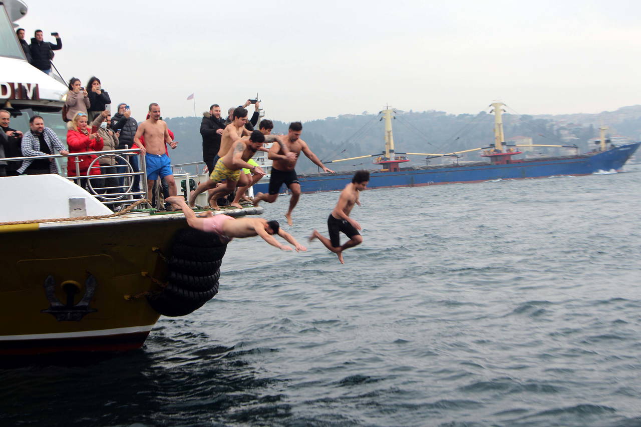 Haçın atılmasıyla birlikte tekneden atlayan 7 kişi haçı çıkarmak için İstanbul Boğazının soğuk sularına atladı.