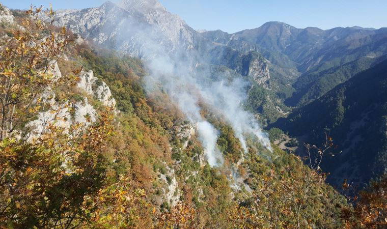 Bugün ise aynı noktada yeniden yangın çıktı. Arazinin sarp olmasından dolayı karadan müdahale edilemezken havadan 2 helikopter ile müdahale sürüyor.