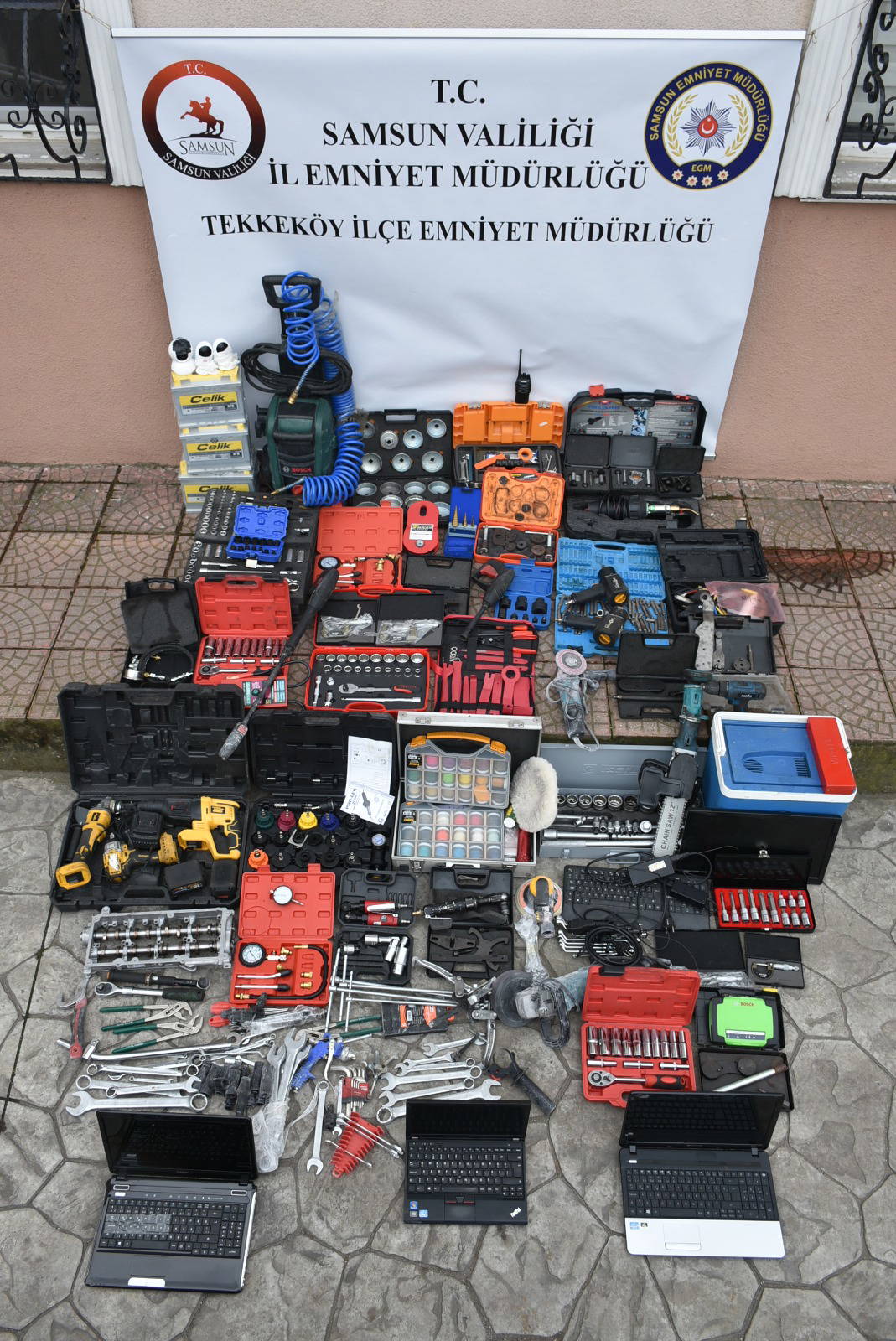 Şüphelilerin Canik ilçesindeki evlerine dün yapılan operasyonda, 3 dizüstü bilgisayar, radyatör test cihazı, ölçüm aleti, 3 akü, tork takımı, hava ölçer, arıza tespit cihazı, kaynak makinesi, akü ölçüm cihazı, hava tabancası, araç yıkama makinesi, cila makinesi, elektrikli testere, matkap ve lokma takımı ele geçirildi.