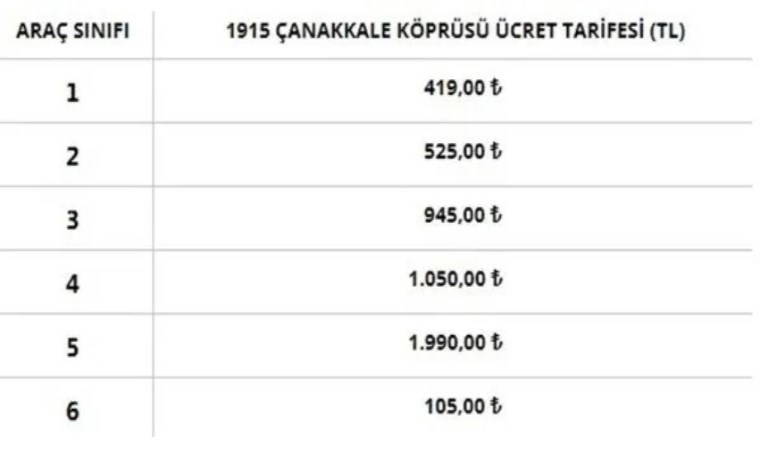 1915 Çanakkale Köprüsü geçiş ücreti ise 419 lira oldu.