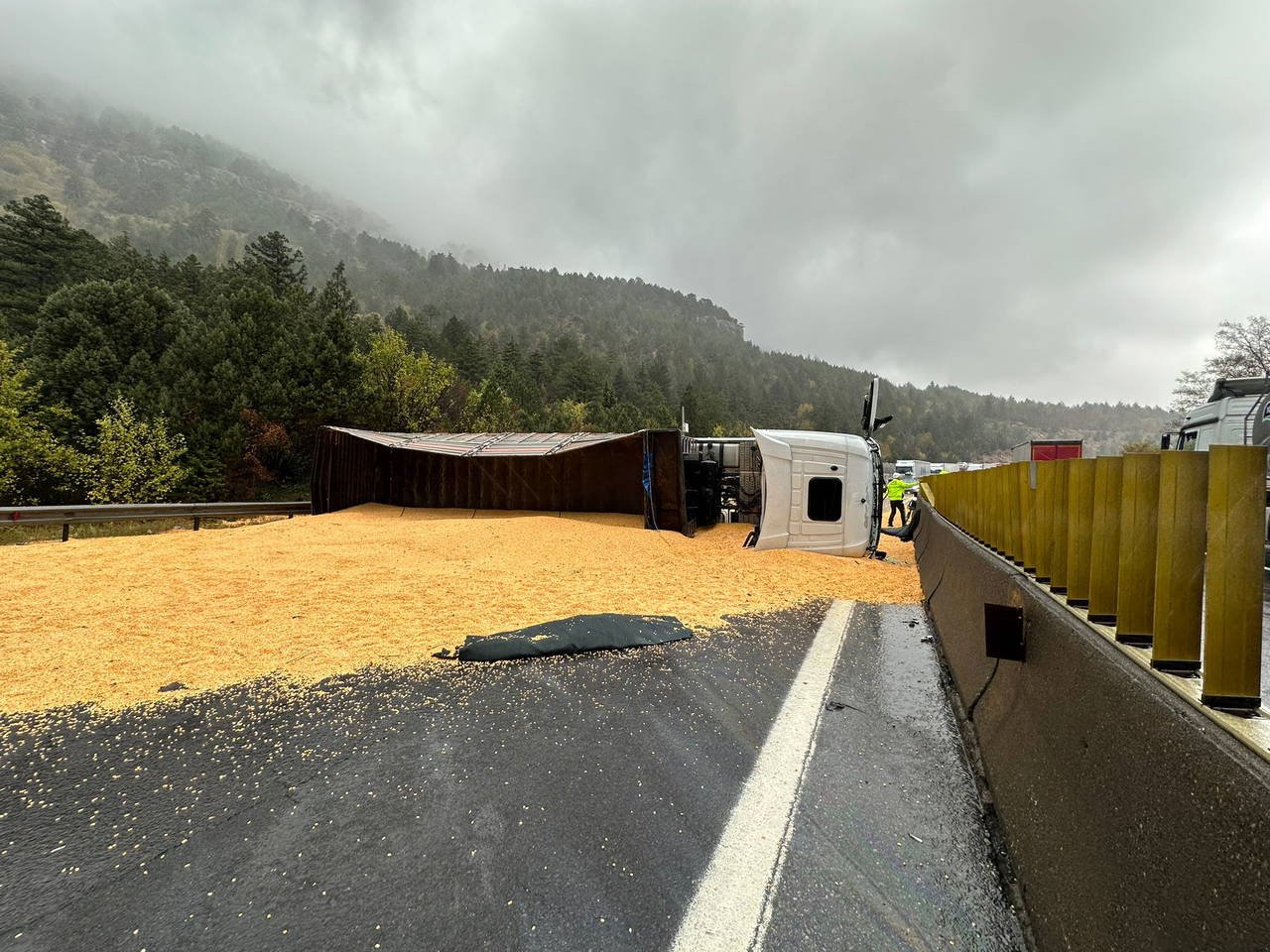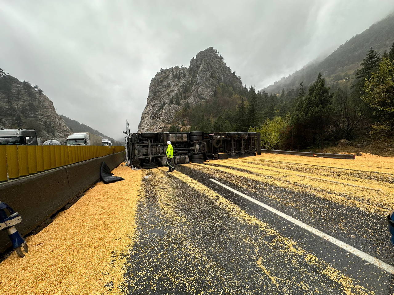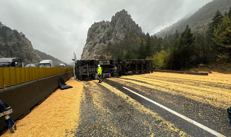 Pozantı-Ankara Otoyolu'nun Adana istikametindeki Gülek mevkisinde tahıl yüklü TIR, ismi açıklanmayan sürücüsünün kontrolünden çıkarak bariyerlere çarptıktan sonra yan yattı.