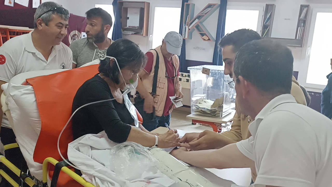 Cumhurbaşkanı Seçimleri ikinci oylaması kapsamında Bodrum Devlet Hastanesi'nde tedavi gören Emine Topçuoğlu, oksijen tüpüyle ambulansa koyularak oy kullanmaya gitti.