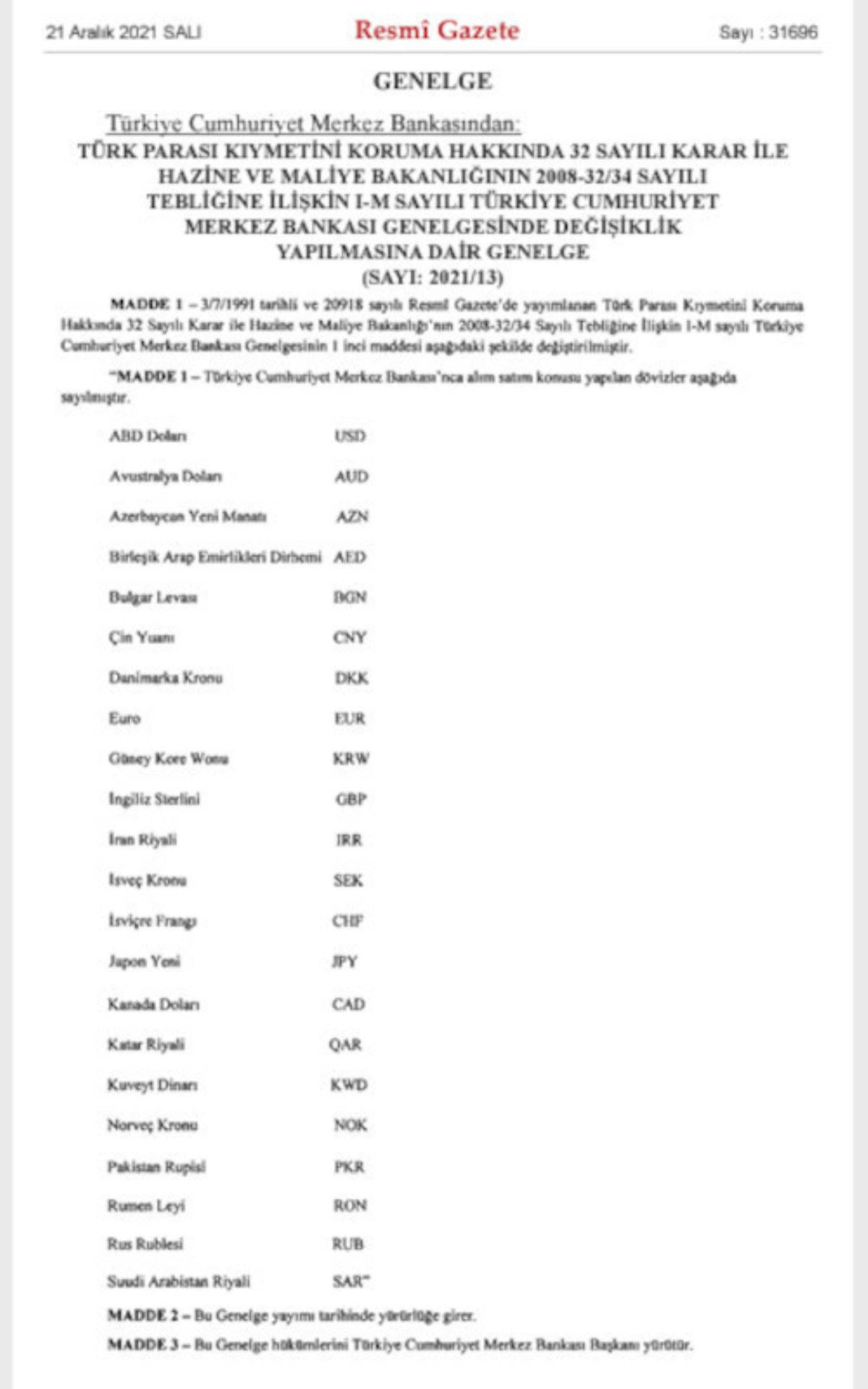 Resmi Gazete'de Türk parası kıymetini koruma hakkında 32 sayılı karar ile Hazine ve Maliye Bakanlığı'nın 2008-32/34 sayılı tebliğine ilişkin I-M sayılı Türkiye Cumhuriyet Merkez Bankası genelgesinde değişiklik yapılmasına dair genelge de yayımlandı.