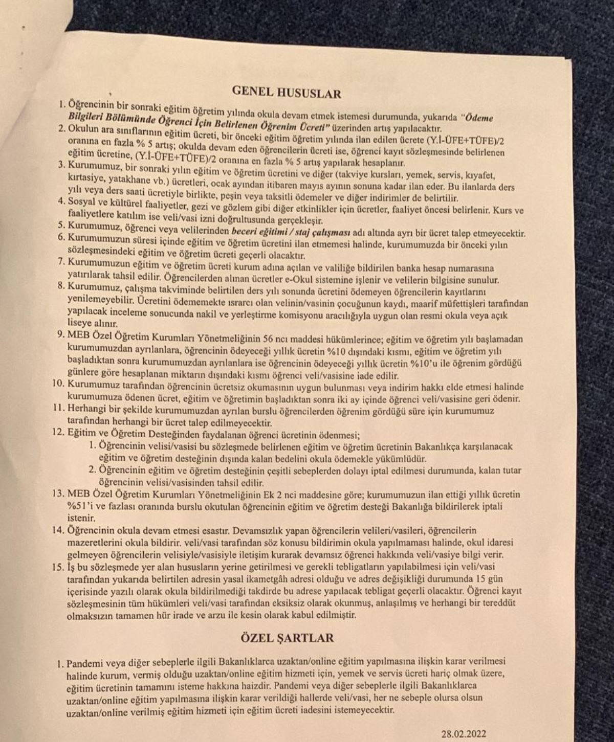 Aynı zamanda veli olan Avukat Cengiz Serttaş, "Çocuğumuzun okul kaydını yenilemek için okula gittik. Okul yönetimi bize bir fiyat çıkarttı ancak bu fiyat geçen seneye göre oldukça yüksek bir bedeldi. Yemek bedelinin üzerine yüzde 300'e yakın bir zam uygulanmış, yine geçen sene sözleşmemizde olmayan genel gider katılım payı adı altında bir bedel eklemişlerdi. Milli Eğitim Bakanlığının açıkladığı yüzde 65'lik zammın dışında bir bedel ödemek istemediğimizi, fahiş zam yaptıkları bedellerin veliler için tercihe bağlı olduğunu belirttik. Bakanlığın açıkladığı yüzde 65'lik zammın dışında bedel almaları ve bunu zorunlu tutmaları yasal değil. Okul yetkilileri, sistemin buna izin vermediğini ve eğitim bedeli dışında yemek giderleri ile genel gider katılım payı bedellerini ödediğimiz takdirde kaydı yenileyeceklerini söyledi. Özellikle zincir okulların sistemleri tek bir merkeze bağlı olduğu için bu bedelleri ödemediğimiz zaman sistemin kayıt yenilemeye izin vermediğini belirttiler. Biz de sadece okulun eğitim bedelini okulun hesabına gönderdik ancak okulun merkezinden bu tutarın eksik olduğu ifade edilerek bir gün sonra parayı hesabımıza geri gönderdiler" dedi.