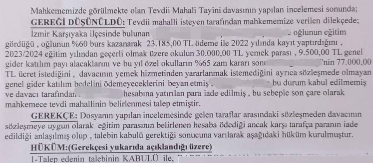Yaklaşık 300'e yakın veli ile bir araya geldiklerini ve okula dilekçe yolladıklarını kaydeden Serttaş, "Ocak ayında ödeme yapıldığı zaman özel okullar bir takım indirimler yapar. Biz bu indirimlerden yararlanmak için ocak ayında ödeme yapmıştık ancak para iade edilince geri gelen bedeller üzerinden Sulh Hukuk Mahkemesinde tespit davası açtım. Alacaklının temerrüdüne dayanarak karşı tarafın alacaklı olduğu halde kabul etmediğini belirtip ödeme yerinin mahkeme vasıtasıyla belirlenmesi talebinde bulundum. Ancak veliler benim gibi tevdii mahali tayini davası açmadan özel okulun istediği tüm bedeli ödeyebilir, kayıt yaptırdıktan sonra tüketici hakem heyetine başvurarak fazladan ödedikleri parayı iade talep edebilir. Oradan da olumsuz bir sonuç çıkarsa veliler, ara bulucuya giderek bu paranın iadesini talep edebilir ve daha sonra dava yoluna gidebilirler. Sebepsiz zenginleşme veya gabin davası açıp iade talep edebilirler" bilgisini verdi.