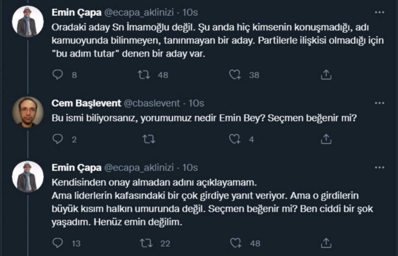 Gazeteci Emin Çapa, Halk TV’de yaptığı açıklamalarda CHP Genel Başkanı Kemal Kılıçdaroğlu’nun adayının belli olduğunu ve bu kişinin siyasetle bir bağının olmadığını iddia etti. Çapa, CHP'nin cumhurbaşkanı adayı hakkında, “CEO'luk yapmış tanınan bir isim. Siyasi partilerle alakası yok. Akşener ve Karamollaoğlu ile de görüştü” demiş, adayın ismini öğrendiğinde şaşırdığını ifade etmişti. Önceki gün de Twitter adresinden bir paylaşım yapan Çapa, yine benzer bir profile işaret etti.