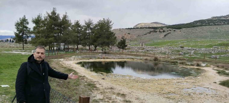 Doç. Dr. Ceyhun Özçelik, Pamukkale'yi besleyen jandarma ve antik havuz bölgesindeki su kaynaklarında ölçüm gerçekleştirdi. Doç. Dr. Özçelik, "UNESCO Dünya Mirası Listesi'nde yer alan Pamukkale ve ülkemizdeki en önemli antik kentlerden biri olan Hierapolis, su sıkıntısıyla karşı karşıya. Pamukkale'yi besleyen jandarma ve antik havuzun bulunduğu su kaynağı ve bir diğer kaynaktan gelen sular travertenler üzerinde akarak mükemmel beyaz görüntüyü sağlıyor. Su miktarı oldukça azalmış durumda. Travertenlere gelen 400 litre saniye olan su debisi, saniyede 100-150 litreye kadar düşmüş durumda" diye konuştu.