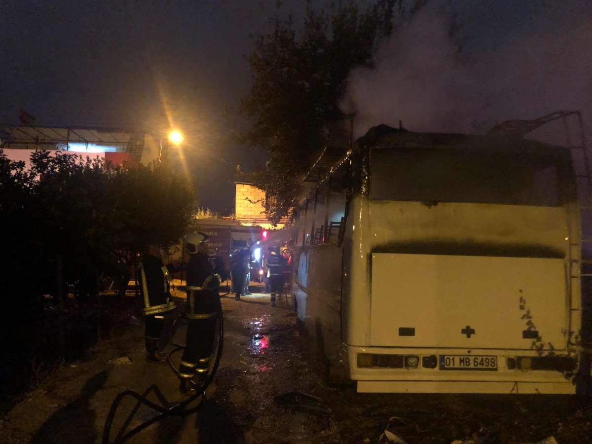Çıkan yangında 01 MB 6498 plakalı otobüs, kısa sürede alevlere teslim oldu. Yangını gören yurttaşlar 112 Acil Çağrı Merkezi arayarak bilgi verdi.
