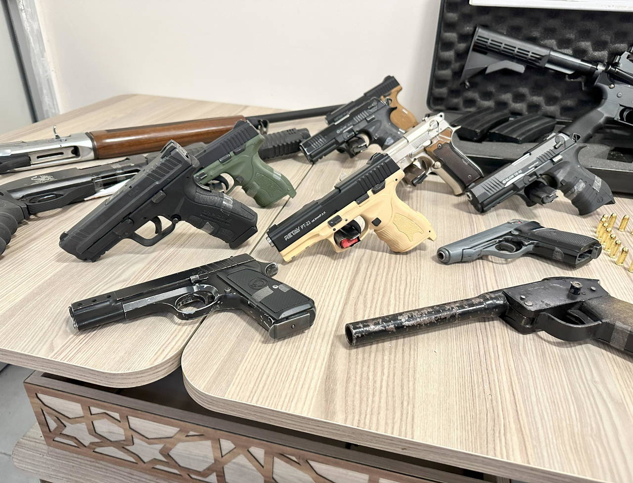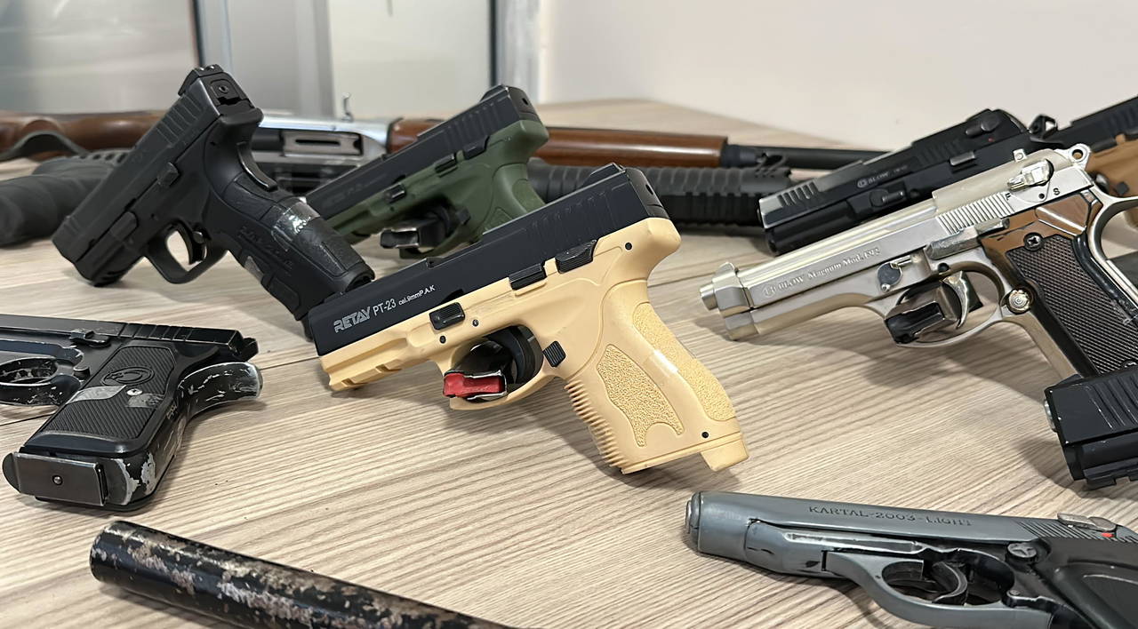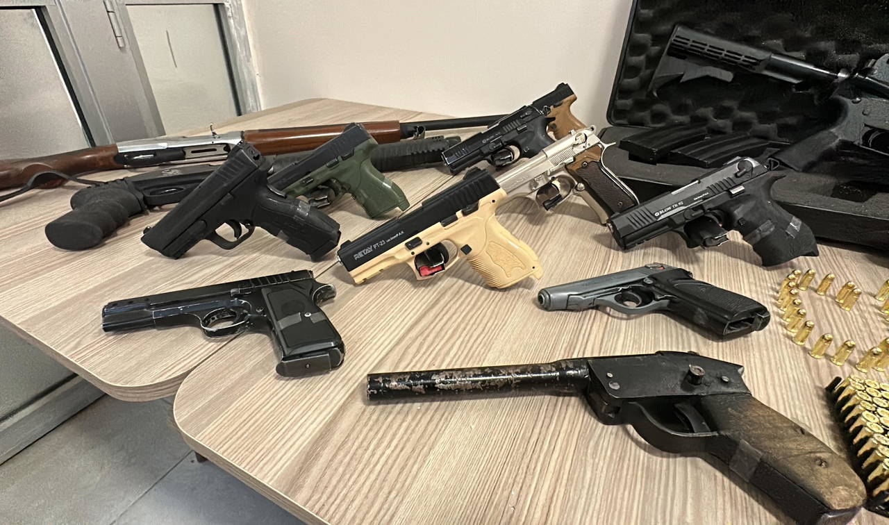 Evlerde yapılan aramalarda 27 ruhsatsız tabanca, 6 ruhsatsız av tüfeği, kurusıkı tabanca, 1600 tabanca fişeği, 45 kurusıkı tabanca fişeği, 23,04 gram kenevir tohumu, hassas terazi ele geçirildi.