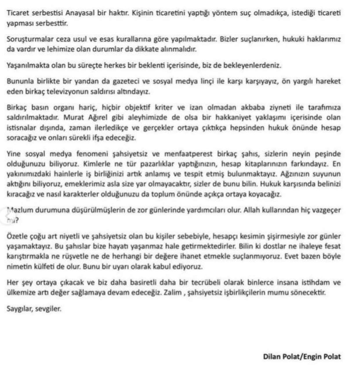 Birkaç basın organı hariç, hiçbir objektif kriter ve izan olmadan akbaba ziyneti ile tarafımıza saldırılmaktadır. Murat Ağırel gibi aleyhimizde de olsa bir hakkaniyet yaklaşımı içerisinde olan istisnalar dışında, zaman ilerledikçe ve gerçekler ortaya çıktıkça hepsinden hukuk önünde hesap soracağız ve onları sürekli ifşa edeceğiz. Yine sosyal medya fenomeni şahsiyetsiz ve menfaatperest birkaç şahıs, sizlerin neyin peşinde olduğunuzu biliyoruz. Kimlerle ne tür pazarlıklar yaptığınızın, hesap kitaplarınızın farkındayız. En yakınımızdaki hainlerle iş birliğinizi artık anlamış ve tespit etmiş bulunmaktayız. Ağzınızın suyunun aktığını biliyoruz, emeklerimiz asla size yar olmayacaktır, sizler de bunu bilin. Hukuk karşısında belinizi kıracağız ve nasıl karakterler olduğunuzu da toplum önünde açıkça ortaya koyacağız. Mazlum durumuna düşürülmüşlerin de zor günlerinde yardımcıları olur. Allah kullarından hiç vazgeçer mi? Özetle çoğu art niyetli ve şahsiyetsiz olan bu kişiler sebebiyle, hesapçı kesimin şişirmesiyle zor günler yaşamaktayız. Bu şahıslar bize hayatı yaşanmaz hale getirmektedirler. Bilin ki dostlar ne ihaleye fesat karıştırmakla ne rüşvetle ne de herhangi bir değere ihanet etmekle suçlanmıyoruz. Evet bazen böyle nimetin külfeti de olur. Bunu bir uyarı olarak kabul ediyoruz. Her şey ortaya çıkacak ve biz daha basiretli daha bir tecrübeli olarak binlerce insana istihdam ve ülkemize artı değer sağlamaya devam edeceğiz. Zalim, şahsiyetsiz işbirlikçilerin mumu sönecektir. Saygılar, sevgiler. Dilan Polat/Engin Polat" ifadelerine yer verdi.