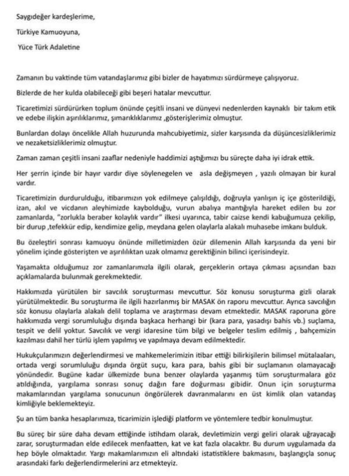 Polat, açıklamasında, "Zamanın bu vaktinde tüm vatandaşlarımız gibi bizler de hayatımızı sürdürmeye çalışıyoruz. Bizlerde de her kulda olabileceği gibi beşeri hatalar mevcuttur. Ticaretimizi sürdürürken toplum önünde çeşitli insani ve dünyevi nedenlerden kaynaklı bir takım etik ve edebe ilişkin aşırılıklarımız, şımarıklıklarımız, gösterişlerimiz olmuştur. Bunlardan dolayı öncelikle Allah huzurunda mahcubiyetimiz, sizler karşısında da düşüncesizliklerimiz ve nezaketsizliklerimiz olmuştur. Zaman zaman çeşitli insani zaaflar nedeniyle haddimizi aştığımızı bu süreçte daha iyi idrak ettik. Her şerrin içinde bir hayır vardır diye söylenegelen ve asla değişmeyen, yazılı olmayan bir kural vardır. Ticaretimizin durdurulduğu, itibarımızın yok edilmeye çalışıldığı, doğruyla yanlışın iç içe gösterildiği, izan, akıl ve vicdanın aleyhimizde kaybolduğu, vurun abaliya mantığıyla hareket edilen bu zor zamanlarda, "zorlukla beraber kolaylık vardır" ilkesi uyarınca, tabir caizse kendi kabuğumuza çekilip, bir durup,tefekkür edip, kendimize gelip, meydana gelen olaylarla alakalı muhasebe imkanı bulduk. Bu özeleştiri sonrası kamuoyu önünde milletimizden özür dilemenin Allah karşısında da yeni bir yönelim içinde gösterişten ve aşırılılıktan uzak olmamız gerektiğinin bilinci içerisindeyiz. Yaşamakta olduğumuz zor zamanlarımızla ilgili olarak, gerçeklerin ortaya çıkması açısından bazı açıklamalarda bulunmak gerekmektedir. Hakkımızda yürütülen bir savcılık soruşturması mevcuttur. Söz konusu soruşturma gizli olarak yürütülmektedir. Bu soruşturma ile ilgili hazırlanmış bir MASAK ön raporu mevcuttur. Ayrıca savcılığın söz konusu olaylarla alakalı delil toplama ve araştırması devam etmektedir. MASAK raporuna göre hakkımızda vergi sorumluluğu dışında başkaca herhangi bir (kara para, yasadışı bahis vb.) suçlama, tespit ve delil yoktur. Savcılık ve vergi idaresine tüm bilgi ve belgeler teslim edilmiş, bahçemizin kazılması dahil her türlü işlem yapılmış ve yapılmaya devam edilmektedir. Hukukçularımızın değerlendirmesi ve mahkemelerimizin itibar ettiği bilirkişilerin bilimsel mütalaaları, ortada vergi sorumluluğu dışında örgüt suçu, kara para, bahis gibi bir suçlamanın olamayacağı yönündedir. Bugüne kadar ülkemizde buna benzer olaylarda yaşanmış tüm soruşturmalara göz atıldığında, yargılama sonrası sonuç dağın fare doğurması gibidir. Onun için soruşturma makamlarından yargılama sonucunun öngörülerek davranmalarını en üst kimlik olan vatandaş kimliğiyle beklemekteyiz. Şu an tüm banka hesaplarımıza, ticarimizin işlediği platform ve yöntemlere tedbir konulmuştur. Bu süreç bir süre daha devam ettiğinde istihdam olarak, devletimizin vergi geliri olarak uğrayacağı zarar, soruşturmadan elde edilecek menfaatten, kat ve kat fazla olacaktır. Bu durum uygulamada da hep böyle olmaktadır. Yargı makamlarımızın eli altındaki istatistiklere bakmasını, başlangıçla sonuç arasındaki farkı değerlendirmelerini arz etmekteyiz. Ticaret serbestisi Anayasal bir haktır. Kişinin ticaretini yaptığı yöntem suç olmadıkça, istediği ticareti yapması serbesttir. Soruşturmalar ceza usul ve esas kurallarına göre yapılmaktadır. Bizler suçlanırken, hukuki haklarımız da vardır ve lehimize olan durumlar da dikkate alınmalıdır. Yaşanılmakta olan bu süreçte herkes bir beklenti içerisinde, biz de bekleyenlerdeniz.