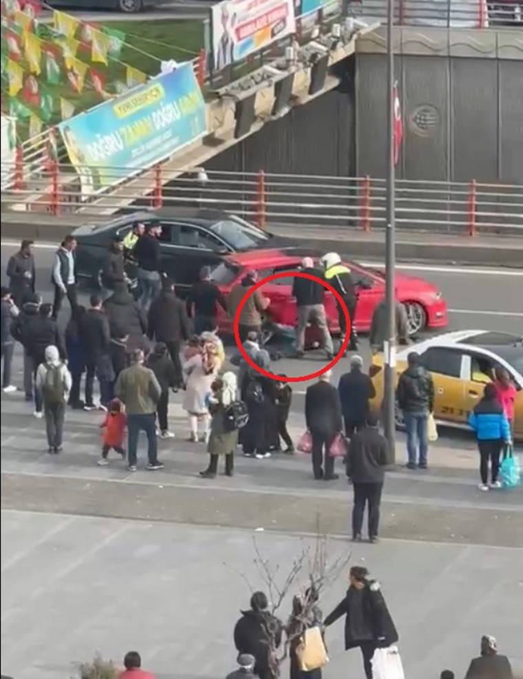 Bu sırada çevredekiler araya girerek tarafları sakinleştirmeye çalıştı. Başka bir trafik ekibi daha gelerek olaya müdahale etmeye çalıştı. Kargaşa sırasında sürücü, otomobiline binip hareket ettirdi. Trafik polislerinin üzerine otomobili süren Y.E.Y., tarafları ayırmaya çalışan bir kişiye çarptı. Yere düşen kişi ezilmekten son andan kurtuldu. O anlar cep telefonuyla görüntülenirken, trafik polisleri de otomobili takibe aldı.