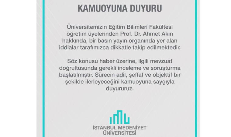 "Üniversitemizin Eğitim Bilimleri Fakültesi öğretim üyelerinden Prof. Dr. Ahmet Akın hakkında, bir basın yayın organında yer alan iddialar tarafımızca dikkatle takip edilmektedir. Söz konusu haber üzerine, ilgili mevzuat doğrultusunda gerekli inceleme ve soruşturma başlatılmıştır. Sürecin adil, şeffaf ve objektif bir şekilde ilerleyeceğini kamuoyuna saygıyla duyururuz."