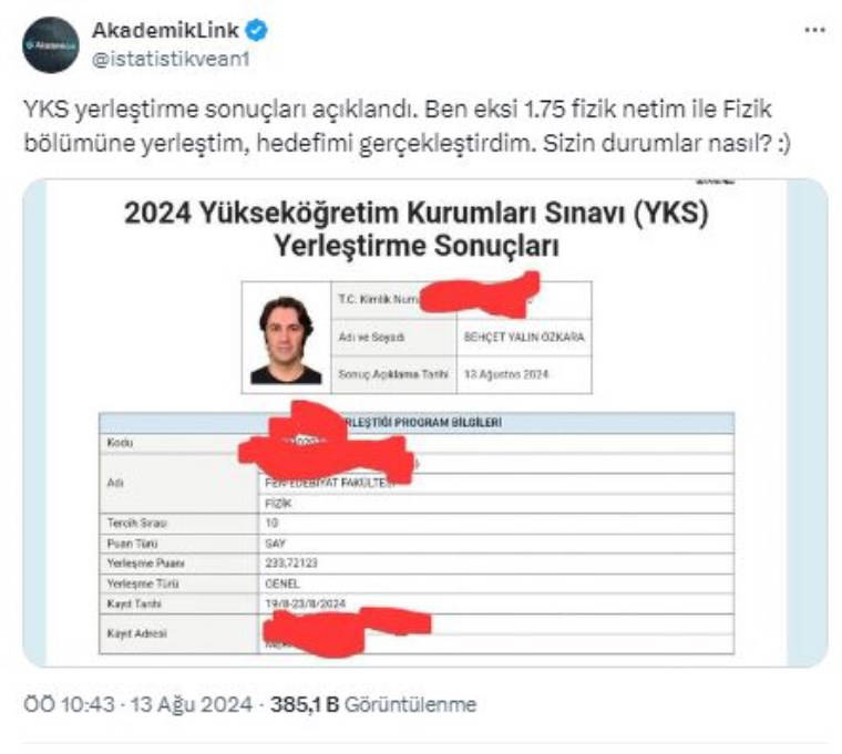 Sosyal medya platformu X'teki AkademikLink isimli hesabından yerleştirme sonuçlarının görselini paylaşan Özkara,"Ben eksi 1.75 fizik netim ile Fizik bölümüne yerleştim, hedefimi gerçekleştirdim. Sizin durumlar nasıl?" ifadelerini kullandı.