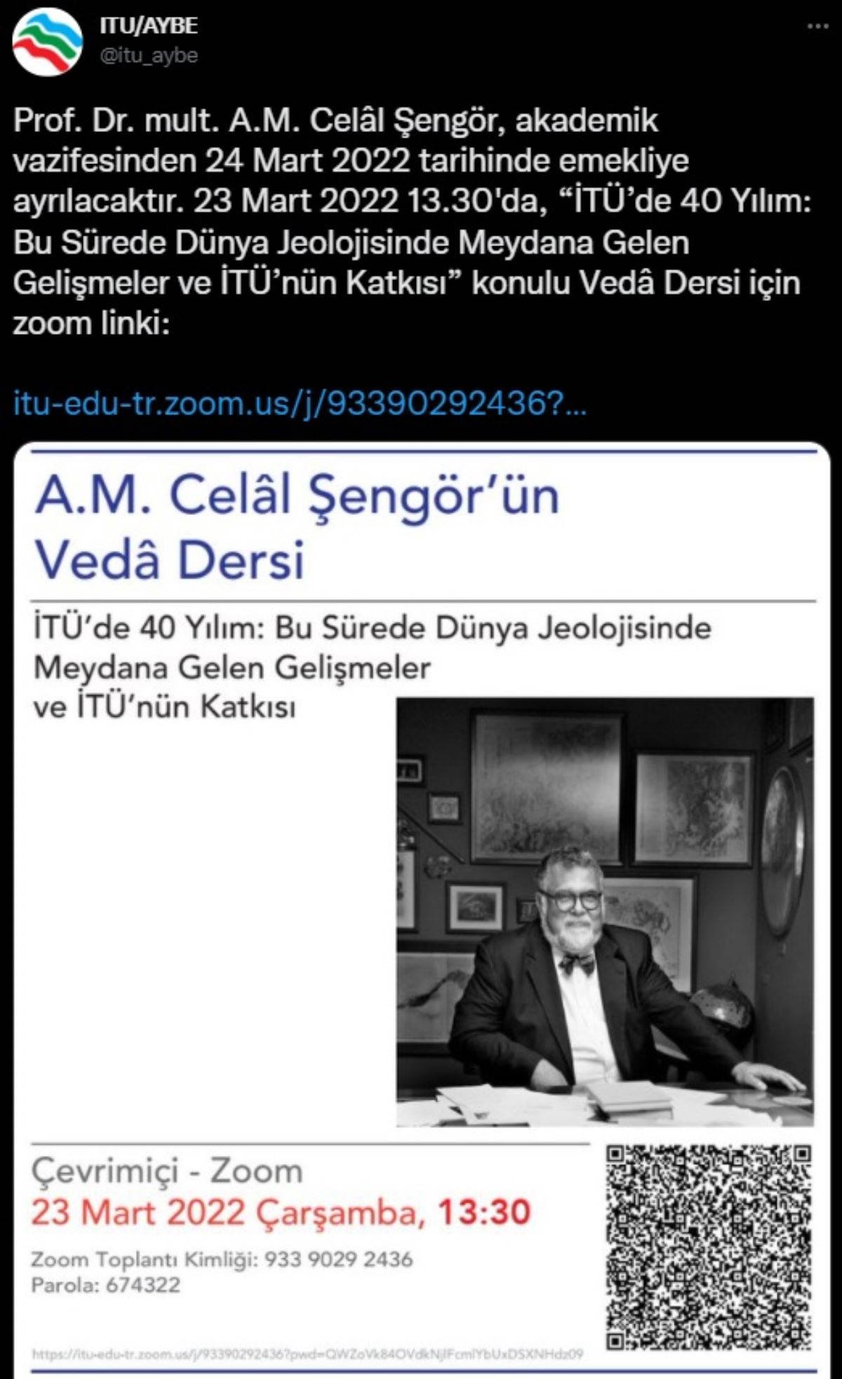 Sosyal medyadan yapılan paylaşımda,"Prof. Dr. Mult. A.M. Celâl Şengör, akademik vazifesinden 24 Mart 2022 tarihinde emekliye ayrılacaktır" ifadeleri kullanıldı. Öte yandan paylaşımda, Şengör'ün veda dersi için Zoom linki de verildi.