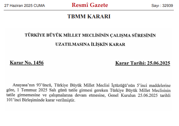 Resmi Gazete’de yayımlanan karara göre Türkiye Büyük Millet Meclisi’nin (TBMM) çalışma süresi uzatıldı.