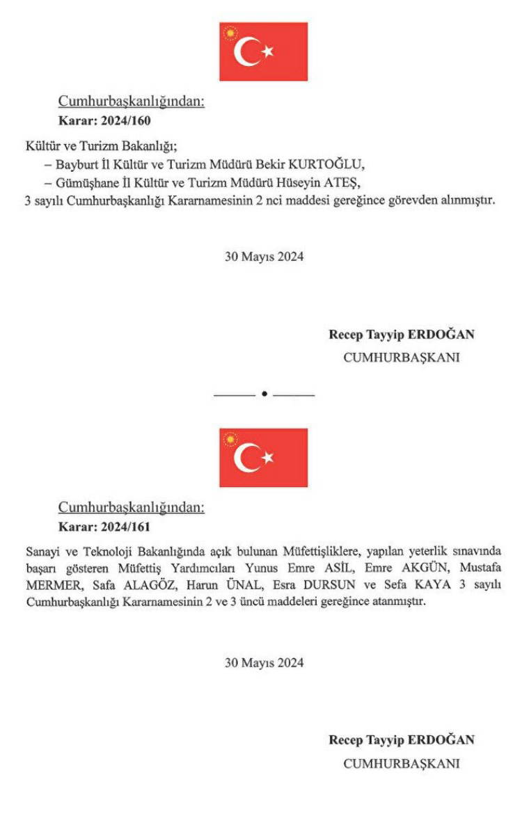 Erdoğan, Bayburt İl Kültür ve Turizm Müdürü Bekir Kurtoğlu ile Gümüşhane İl Kültür ve Turizm Müdürü Hüseyin Ateş'i görevden aldı.