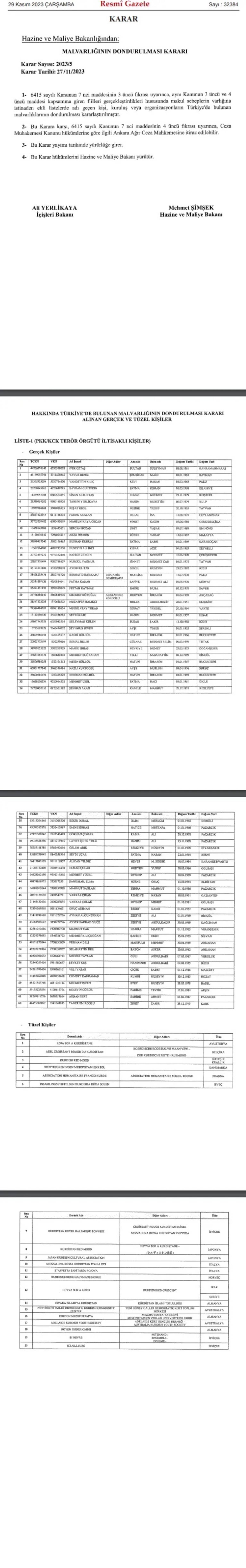 Gazete’de yayımlandı. Kararda, “terör finansmanı” suçlamasıyla 62 kişi ile 20
