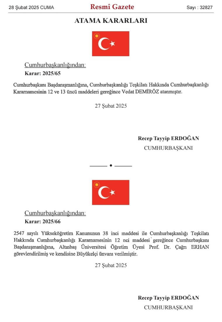 Cumhurbaşkanlığı tarafından yapılan atama kararları Resmi Gazete'de yayımlandı. Cumhurbaşkanı Başdanışmanlığına, Vedat Demiröz atanırken, Altınbaş Üniversitesi Öğretim Üyesi Prof. Dr. Çağrı Erhan da Cumhurbaşkanı Başdanışmanı olarak görevlendirildi ve kendisine Büyükelçi unvanı verildi.