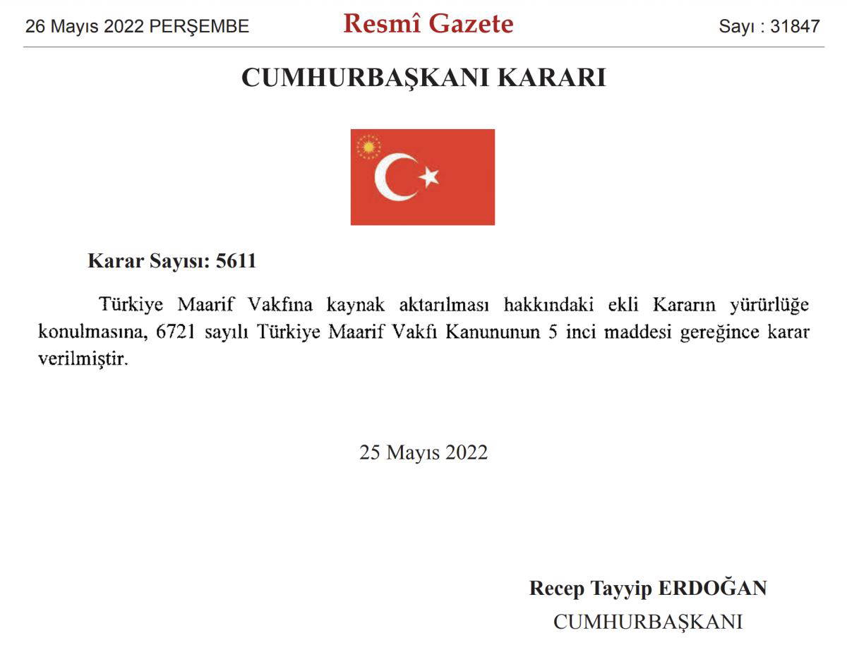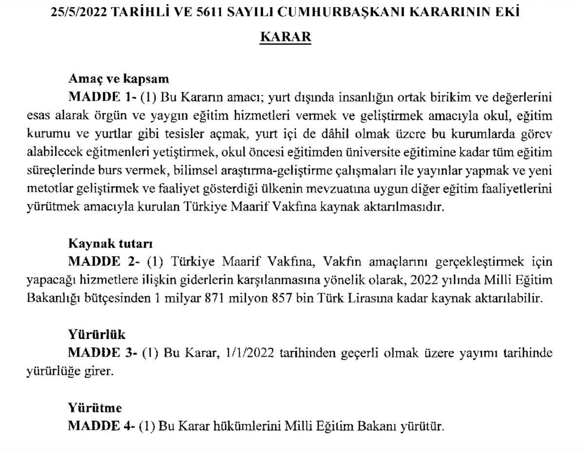 AKP’li Cumhurbaşkanı Recep Tayyip Erdoğan’ın imzasını taşıyan kararda, yurt dışında eğitim hizmeti veren okul, eğitim kurumu ve yurt gibi tesislerin açılması, eğitim faaliyetlerinin yürütülmesi ve öğrencilere burs sağlanması amacı ile Türkiye Maarif Vakfı’na kaynak aktarılacağı belirtildi.