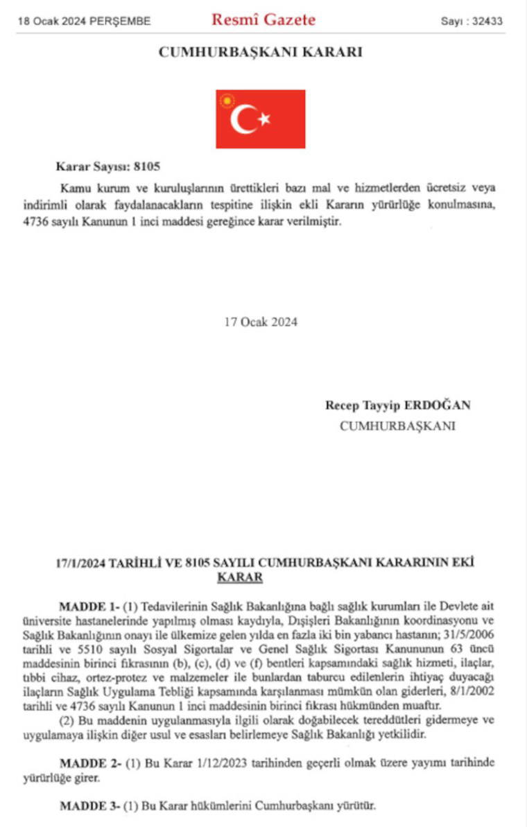 Resmi Gazete'nin bugünkü sayısında yayımlanan ve kamu hizmetlerinden ücretsiz veya indirimli yararlanılabilmesine yönelik 4736 sayılı yasada istisna sağlayacakları belirleyen karara göre, tedavileri Sağlık Bakanlığı ile devlete ait üniversite hastanelerinde yapılmış olması kaydıyla ilgili bakanlıkların koordinasyon ve onayıyla Türkiye'ye gelen yılda en fazla 2 bin yabancı hastanın ilaç, tıbbi cihaz, ortez-protez gibi sağlık giderleri, söz konusu yasanın sınırlayıcı hükmünden muaf olacak.
