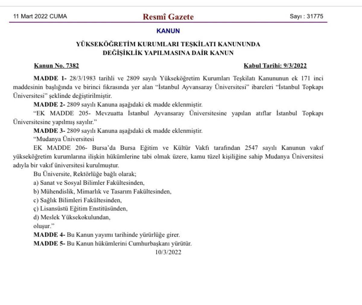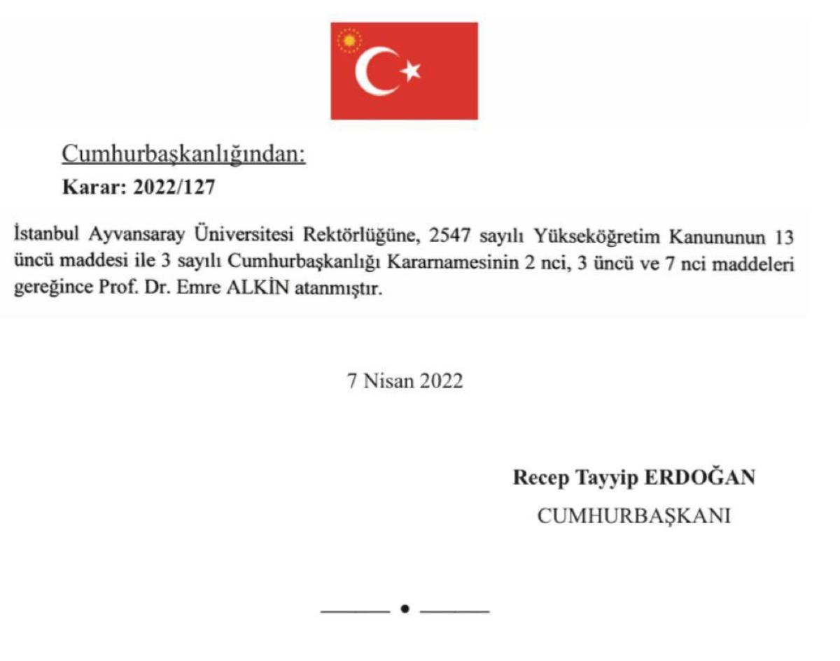 Atama metninde, İstanbul Ayvansaray Üniversitesi’ne yeni rektör atandığı bilgisi de yer aldı. Ancak İstanbul Ayvansaray Üniversitesi’nin adı, 11.03.2022 tarihli Resmi Gazete kararına göre İstanbul Topkapı Üniversitesi olarak değiştirilmişti.