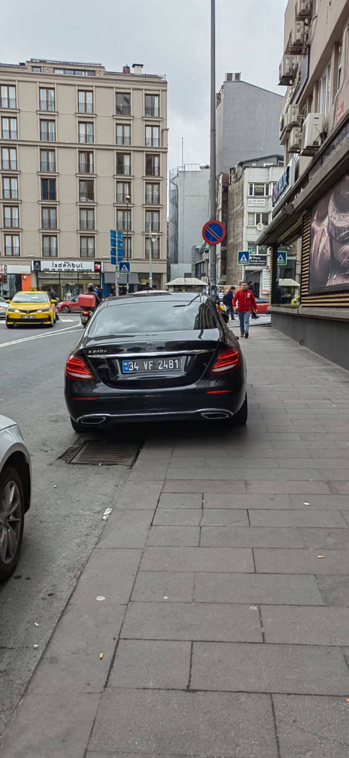 Şişli 19 Mayıs Caddesi Raddison Hotel Şişli'nin karşısındaki kaldırıma park eden resmi plakalı aracın, afet durumunda anayol olarak tayin edilen yolda olduğu da görülüyor.