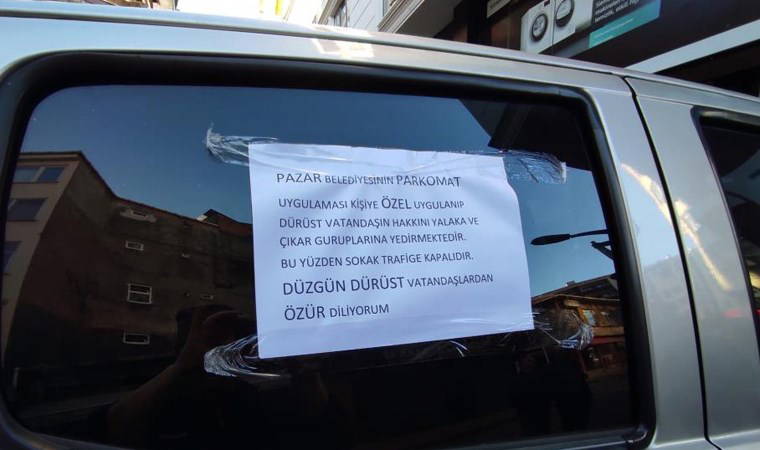 Pazar ilçesinde, 10 Mart Caddesi Şehit Mürsel Basa Sokak’ta yaşanan ilginç protesto, Kadir Atacan isimli esnafın aracını sokağa park etmesiyle başladı. Atacan, aracın üzerine “Pazar Belediyesinin parkomat uygulaması kişiye özel uygulanıp, dürüst vatandaşın hakkını çıkar gruplarına yedirmektedir. Bu yüzden sokak trafiğe kapalıdır. Düzgün, dürüst vatandaşlardan özür diliyorum” yazısını yazdı.