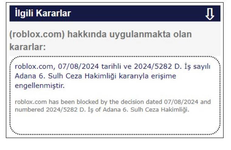 “roblox.com, 07/08/2024 tarihli ve 2024/5282 D. İş sayılı Adana 6. Sulh Ceza Hakimliği kararıyla erişime engellenmiştir.”