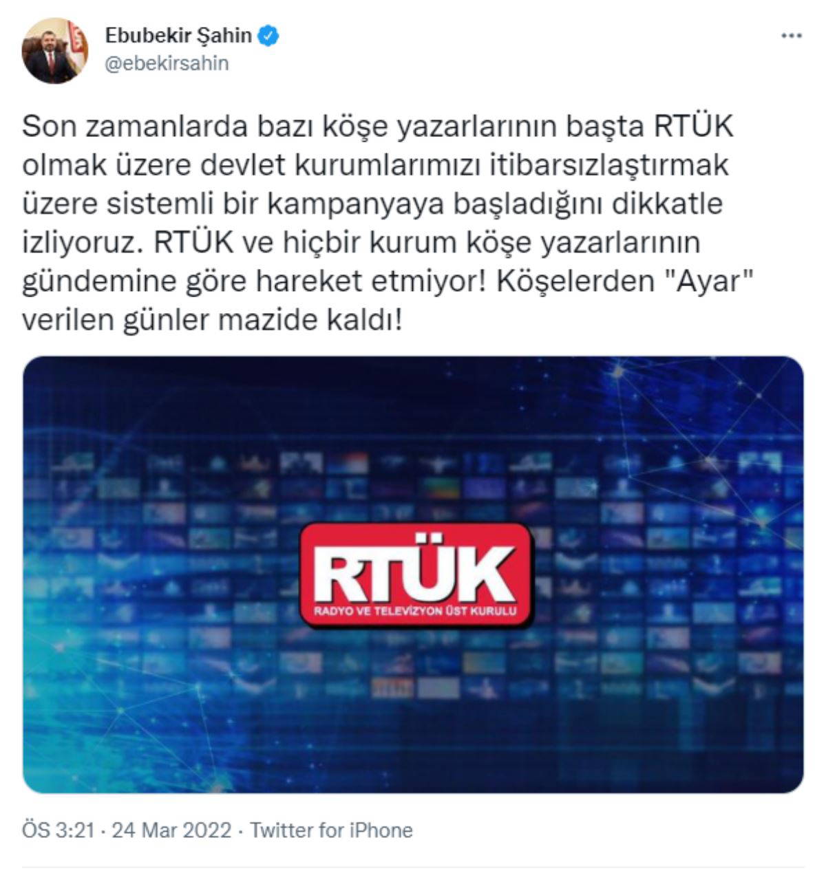 - Son zamanlarda bazı köşe yazarlarının başta RTÜK olmak üzere devlet kurumlarımızı itibarsızlaştırmak üzere sistemli bir kampanyaya başladığını dikkatle izliyoruz. RTÜK ve hiçbir kurum köşe yazarlarının gündemine göre hareket etmiyor! Köşelerden "Ayar" verilen günler mazide kaldı!