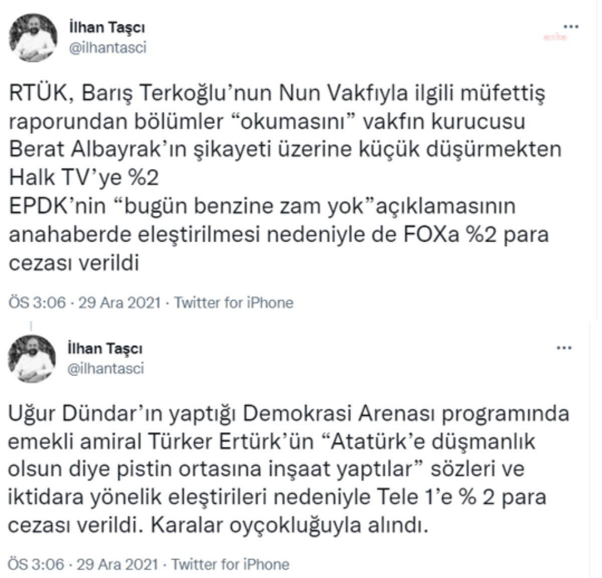 “Barış Terkoğlu’nun Nun Vakfı’yla ilgili müfettiş raporundan bölümler okumasını vakfın kurucusu Berat Albayrak’ın şikayeti üzerine, küçük düşürmekten Halk TV’ye yüzde 2, EPDK’nin ‘bugün benzine zam yok’ açıklamasının ana haberde eleştirilmesi nedeniyle de Fox’a yüzde 2 para cezası verildi. Uğur Dündar’ın yaptığı Demokrasi Arenası programında emekli amiral Türker Ertürk’ün ‘Atatürk’e düşmanlık olsun diye pistin ortasına inşaat yaptılar’ sözleri ve iktidara yönelik eleştirileri nedeniyle Tele 1’e yüzde 2 para cezası verildi. Karalar oyçokluğuyla alındı.”