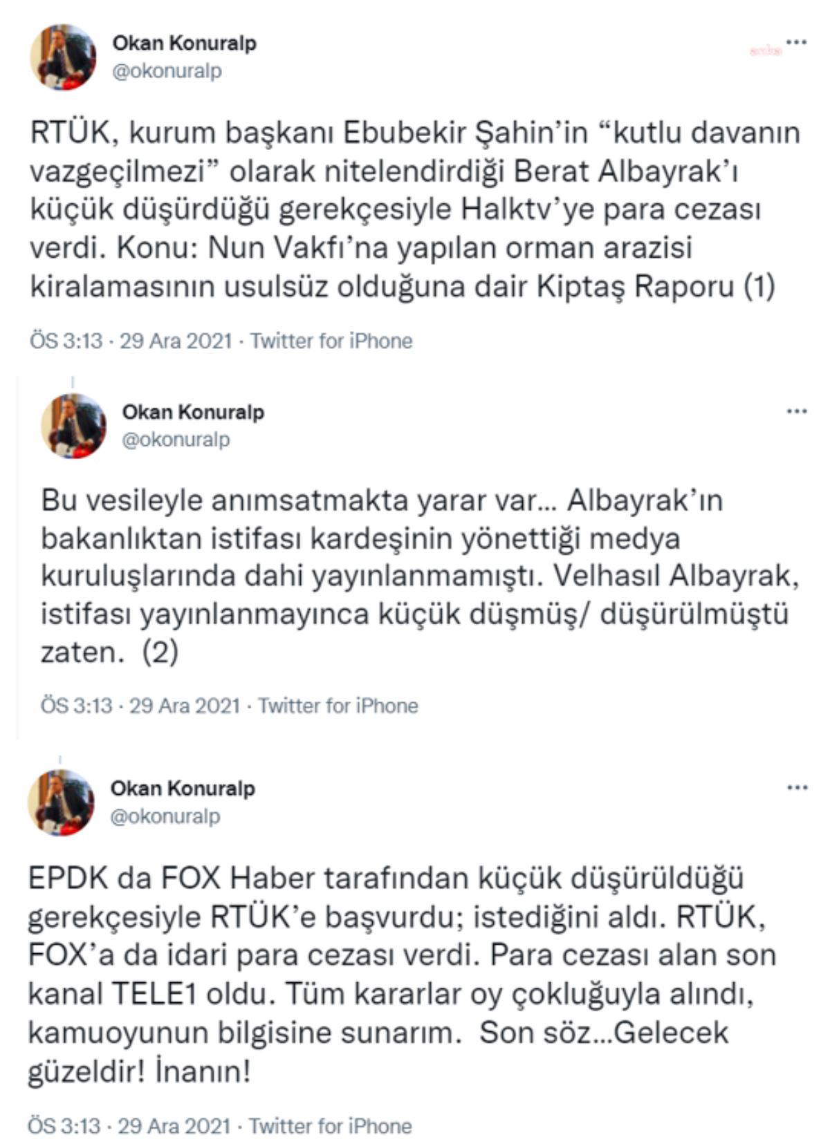 “RTÜK, kurum başkanı Ebubekir Şahin’in ‘kutlu davanın vazgeçilmezi’ olarak nitelendirdiği Berat Albayrak’ı küçük düşürdüğü gerekçesiyle Halk TV’ye para cezası verdi. Konu: Nun Vakfı’na yapılan orman arazisi kiralamasının usulsüz olduğuna dair Kiptaş raporu. Bu vesileyle anımsatmakta yarar var: Albayrak’ın bakanlıktan istifası, kardeşinin yönettiği medya kuruluşlarında dahi yayınlanmamıştı. Velhasıl Albayrak, istifası yayınlanmayınca küçük düşmüş/düşürülmüştü zaten. EPDK da Fox Haber tarafından küçük düşürüldüğü gerekçesiyle RTÜK’e başvurdu; istediğini aldı. RTÜK, Fox’a da idari para cezası verdi. Para cezası alan son kanal TELE1 oldu. Tüm kararlar oyçokluğuyla alındı, kamuoyunun bilgisine sunarım. Son söz: Gelecek güzeldir! İnanın!”