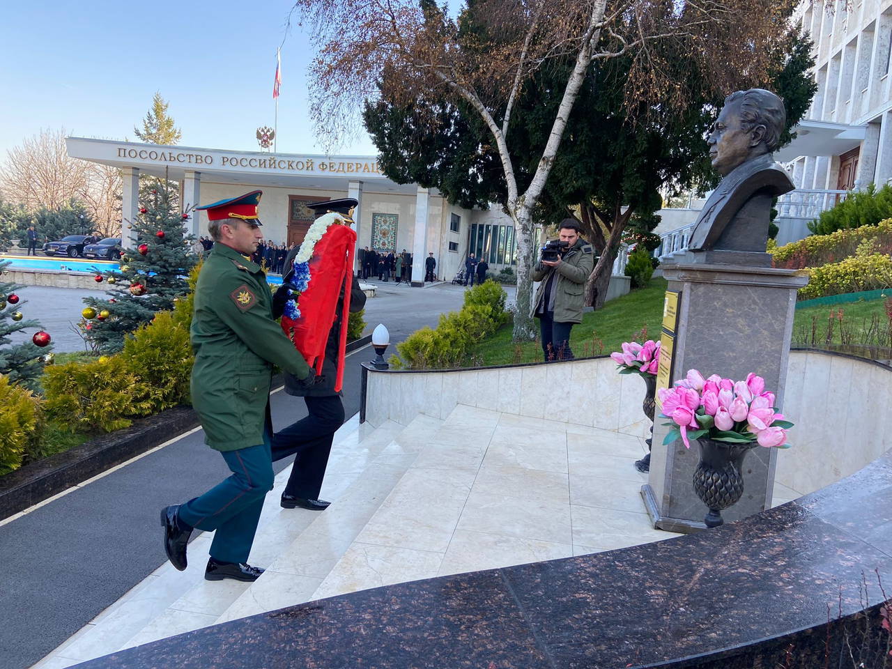Törende ilk olarak Rus askerlerince büyükelçiliğin bahçesindeki Karlov anıtına çiçek bırakıldı. Daha sonra Rusya'nın Ankara Büyükelçisi Yerhov ve törene katılanlar, anıta karanfil bıraktı.