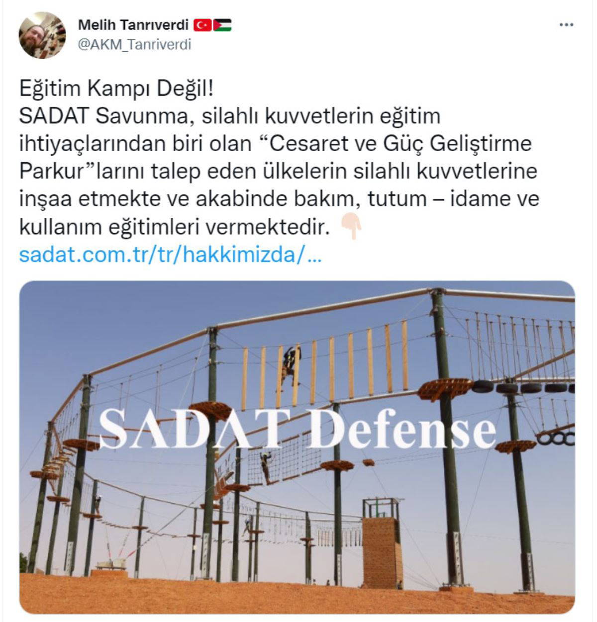 Tanrıverdi, şunları yazdı: “Eğitim Kampı Değil! SADAT Savunma, silahlı kuvvetlerin eğitim ihtiyaçlarından biri olan ‘Cesaret ve Güç Geliştirme Parkur’larını talep eden ülkelerin silahlı kuvvetlerine inşaa etmekte ve akabinde bakım, tutum – idame ve kullanım eğitimleri vermektedir.”