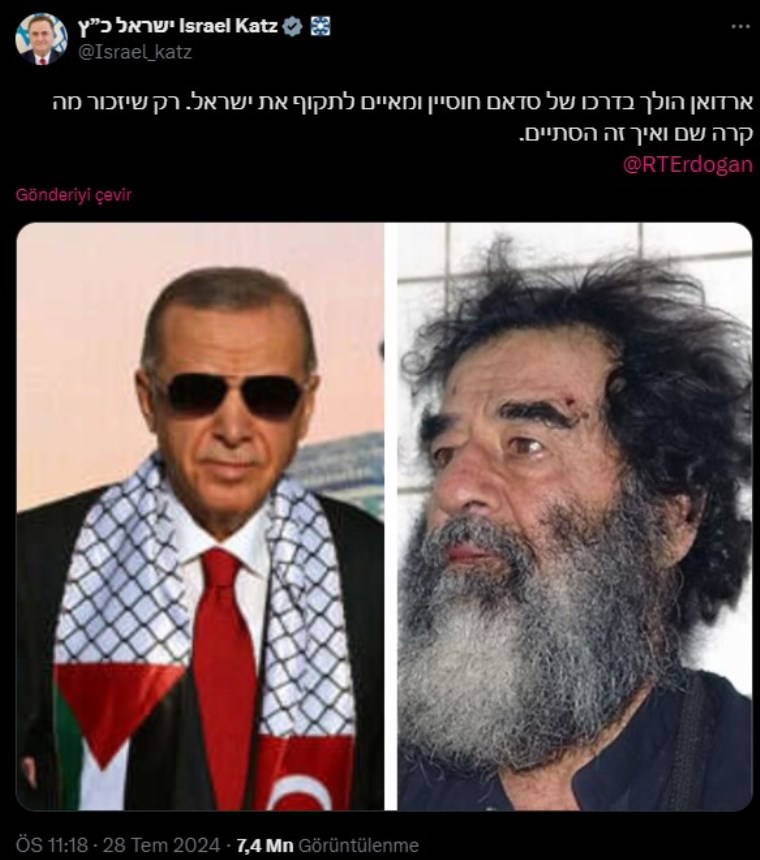 İsrail Dışişleri Bakanı Yisrael Katz'ın, Cumhurbaşkanı Tayyip Erdoğan'ı, Irak’ın eski diktatörü Saddam Hüseyin’e benzetmesi gündem oldu.