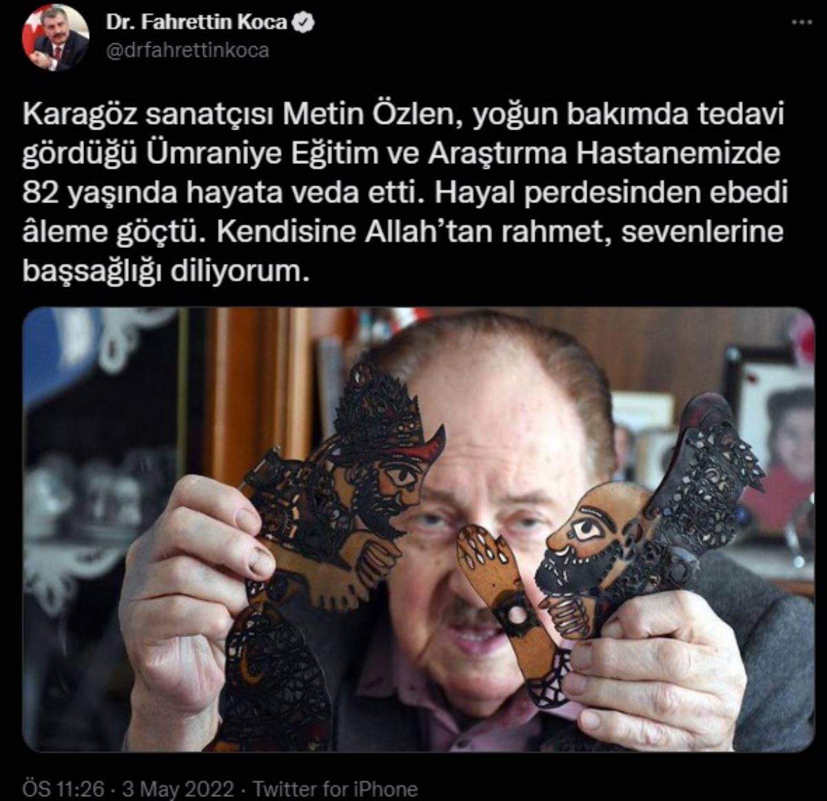 Özlen'in bir fotoğrafına yer veren Koca "Karagöz sanatçısı Metin Özlen, yoğun bakımda tedavi gördüğü Ümraniye Eğitim ve Araştırma Hastanemizde 82 yaşında hayata veda etti. Hayal perdesinden ebedi âleme göçtü. Kendisine Allah’tan rahmet, sevenlerine başsağlığı diliyorum" dedi.