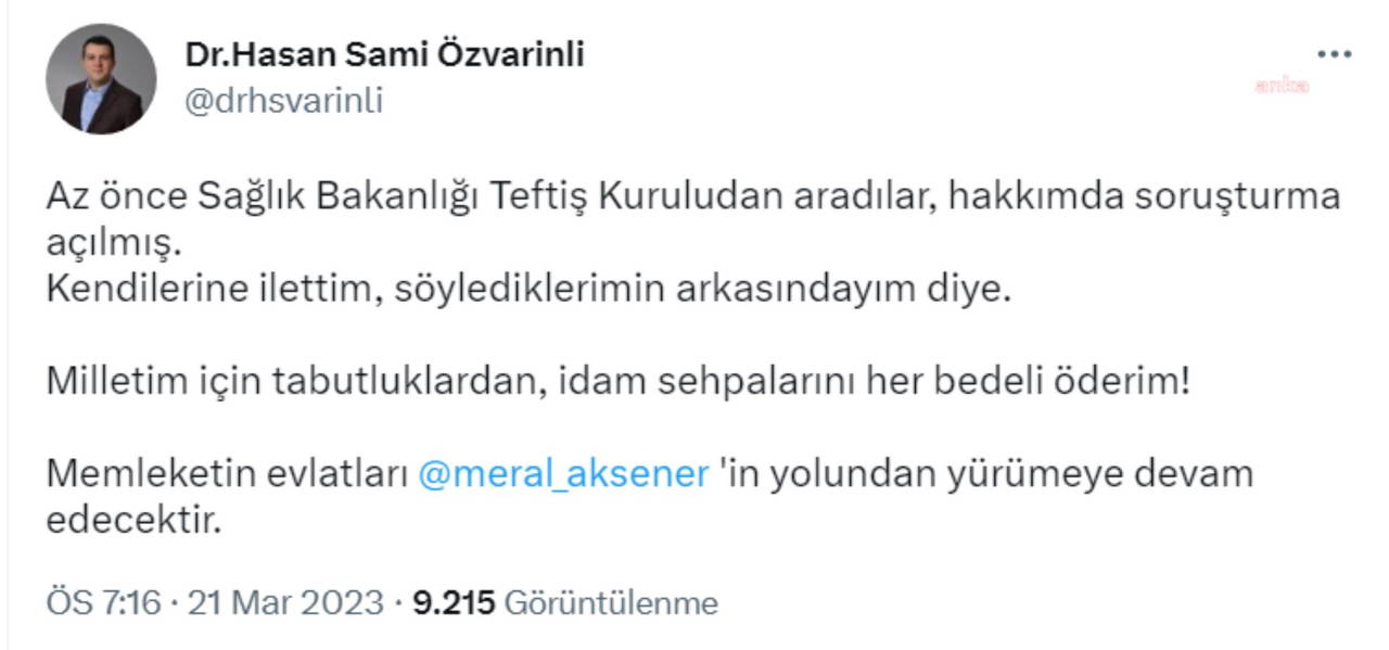 “Az önce Sağlık Bakanlığı Teftiş Kuruludan aradılar, hakkımda soruşturma açılmış. Kendilerine ilettim, söylediklerimin arkasındayım diye. Milletim için tabutluklardan, idam sehpalarını her bedeli öderim! Memleketin evlatları Meral Akşener'in yolundan yürümeye devam edecektir.”