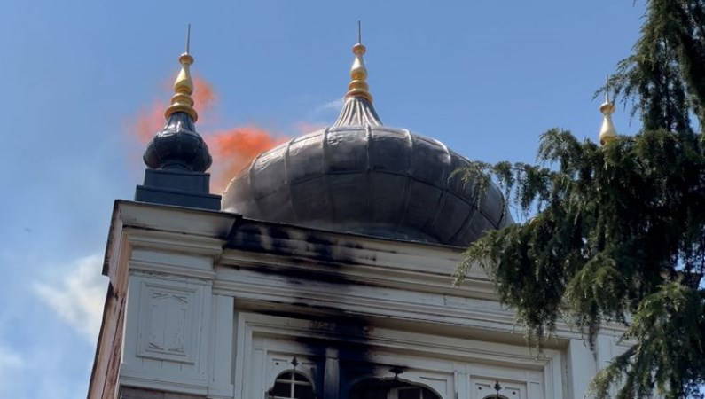 Ekiplerin müdahalesi sırasında binanın yanan kubbesi çöktü. O anlar, kameraya yansıdı.
