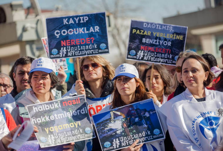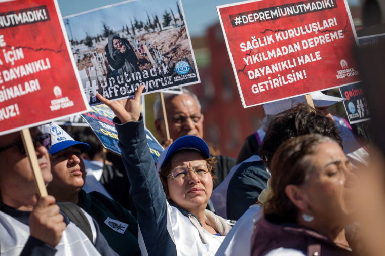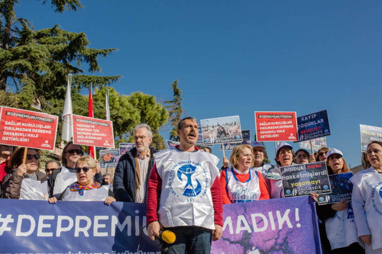 “Depremi unutmadık” sloganıyla bir araya gelen sağlık emekçileri, “Kayıp çocuklar nerede?”, “Sağlık Kuruluşları yıkılmadan depreme dayanıklı hale getirilsin”, “Unutmadık affetmiyoruz” yazılı dövizler taşıdı. Sağlık emekçileri burada, “Unutmak yok, affetmek yok, helalleşmek yok” sloganları attı.