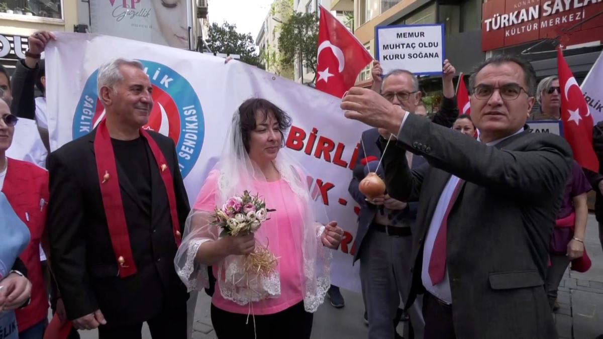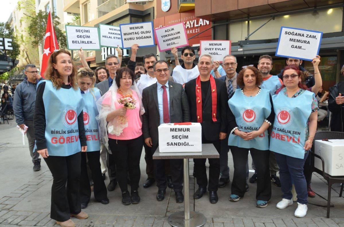 BASK’a bağlı Birlik Sağlık Sen üyesi memurlar bugün İzmir’de maaşlarına ek zam yapılması için basın açıklaması ve protesto eylemi yaptılar. Memurlar ayrıca yanlarında getirdikleri temsili seçim sandığına oy pusulası yerine maaş bordrolarını "Ne kadar zam o kadar oy" diyerek attılar. Kıbrıs Şehitleri Caddesi’ndeki protestoda basın açıklamasını Birlik Sağlık Sen Genel Başkanı Ahmet Doğruyol okudu.