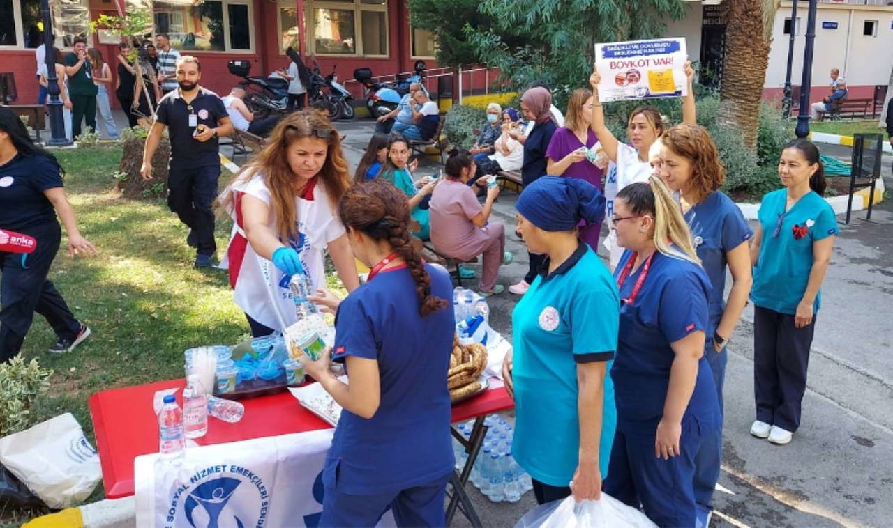 Alsancak Devlet Hastanesinde bir araya gelen sağlık çalışanları "Hastanelerde yemekler şirket eliyle degil, sağlıklı, kaliteli ve doyurucu olarak kamu eliyle verilsin" yazılı pankart açtı. Sağlıkçılar ellerinde “Sağlıklı yemek hastanın da çalışanın da hakkıdır”, “Hastanemizde doyurucu miktarda sağlıklı yemek çıksın”, “Yemekhanelerde özelleştirmelere son verilsin”, “Nöbetlerde gece kahvaltısı doyurucu miktarda verilsin”, “Yemekte taşeron şirkete hayır”, “Sağlıklı ve doyurucu beslenme haktır! Boykot var!” yazılı dövizler açtı.