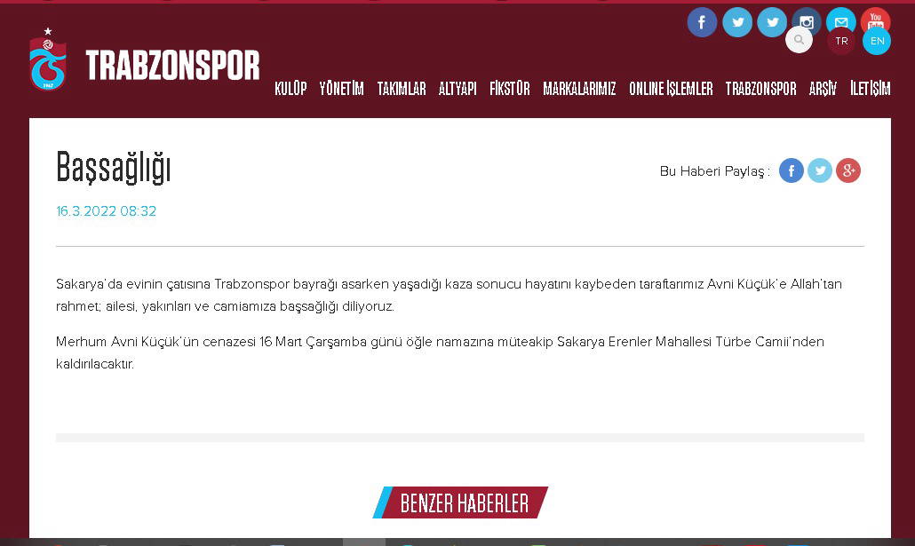 Öte yandan Trabzonspor Kulübü tarafından Avni Küçük için yayımlanan taziye mesajında, "Sakarya'da evinin çatısına Trabzonspor bayrağı asarken yaşadığı kaza neticesinde hayatını kaybeden taraftarımız Avni Küçük'e Allah'tan rahmet, ailesine, yakınlarına ve camiamıza başsağlığı diliyoruz" denildi.