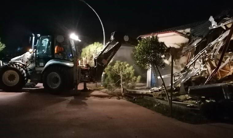 İş makineleri, tatil köyünün dış duvarlarını yıkarak yıkıma başladı. Tek katlı yapılar, ekiplerin 3 saatlik çalışmasıyla yıkıldı.