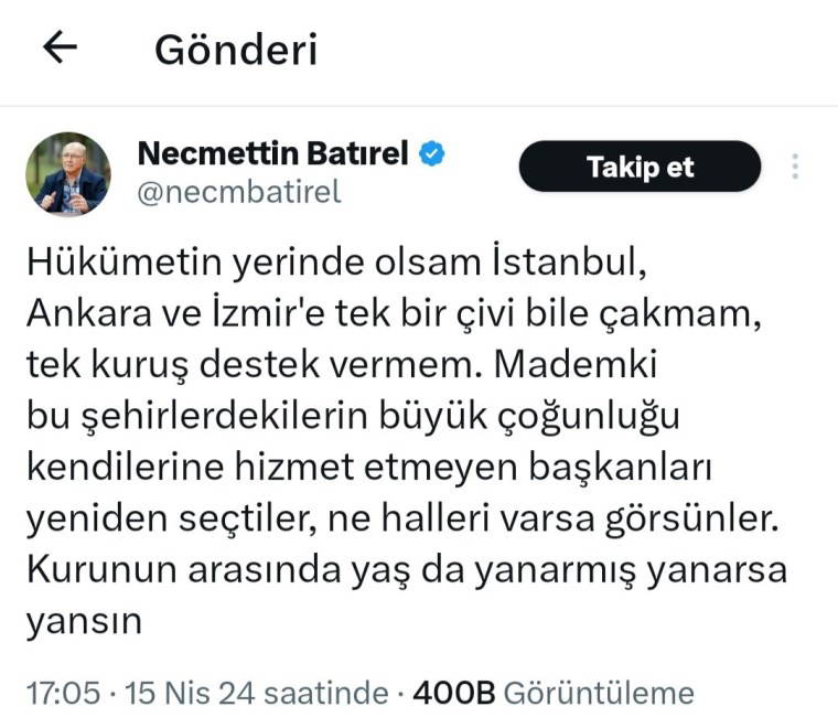 "Hükümetin yerinde olsam İstanbul, Ankara ve İzmir'e tek bir çivi bile çakmam, tek kuruş destek vermem. Mademki bu şehirlerdekilerin büyük çoğunluğu kendilerine hizmet etmeyen başkanları yeniden seçtiler, ne halleri varsa görsünler. Kurunun arasında yaş da yanarmış yanarsa yansın."