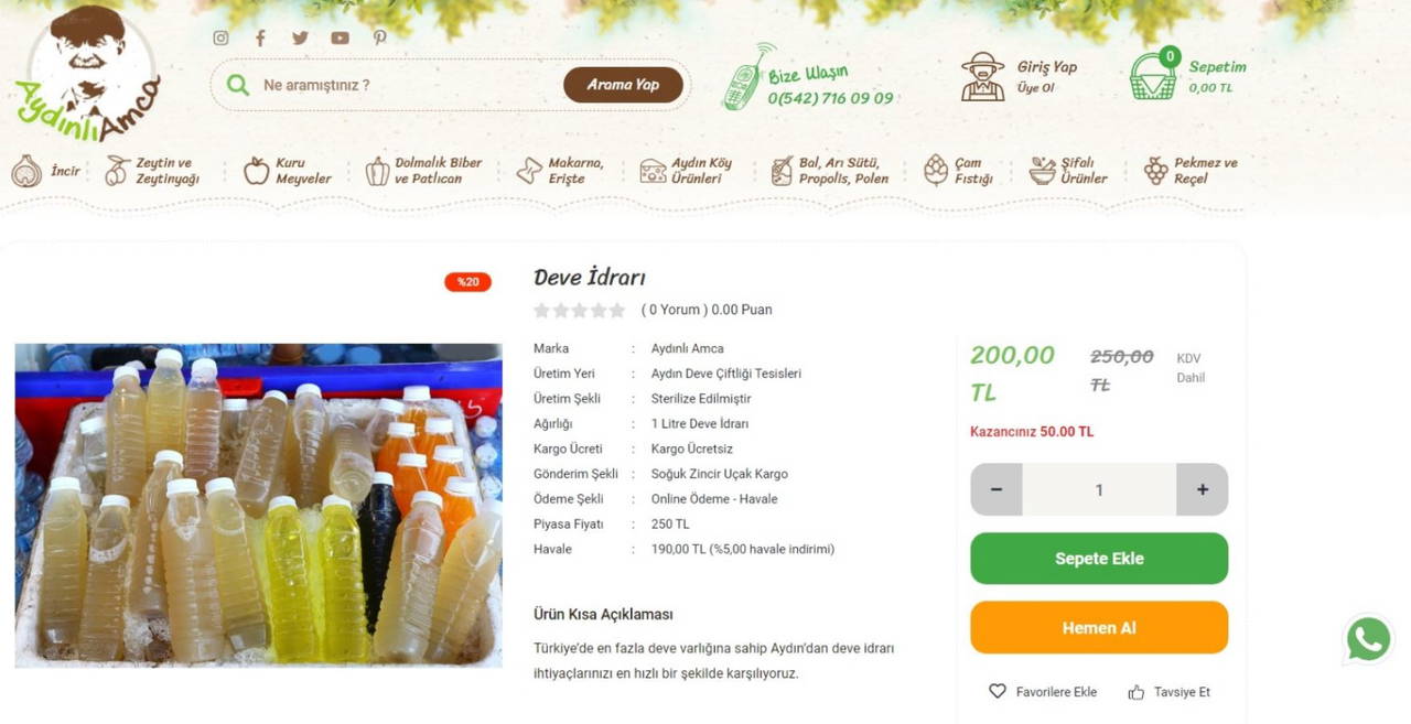 Zeytinyağı, kuru meyve, peynir ve salça gibi ürünlerin satıldığı bir internet sitesinin deve idrarı sattığı sosyal medyaya yansıdı.