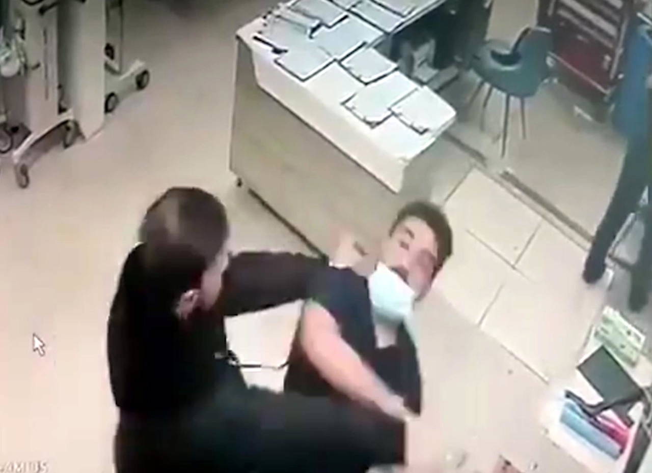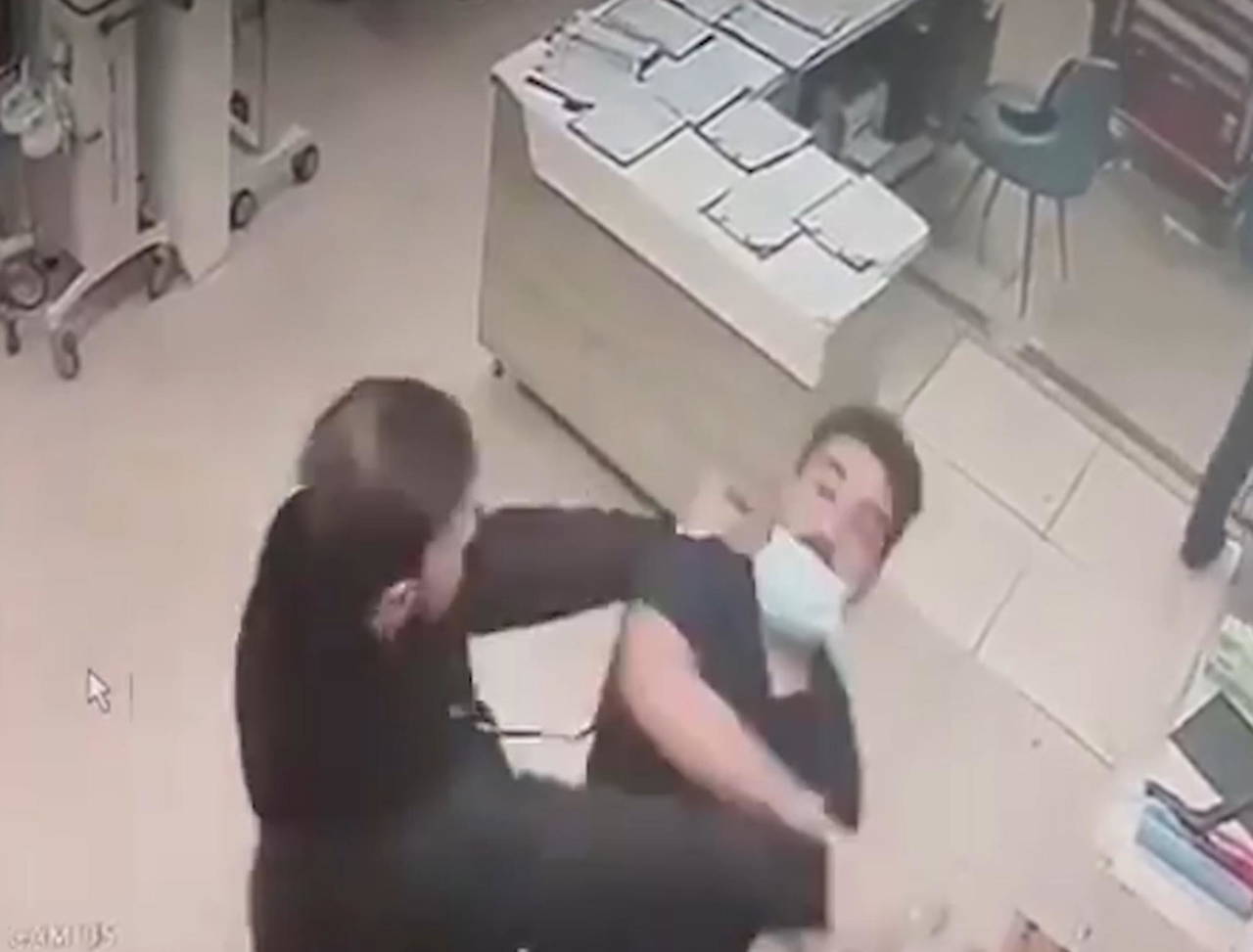 Bu sırada sağlık çalışanları, görüntü çekilmemesini isteyip, kadını dışarıya çıkardı. İddiaya göre, eşinin çıkarılmasına sinirlenen Hüseyin A., tartıştığı hemşire Emrah T.'ye yumruk attı. O anlar güvenlik kamerasına yansırken, araya giren polis ve güvenlik Hüseyin A.'yı güçlükle sakinleştirdi.