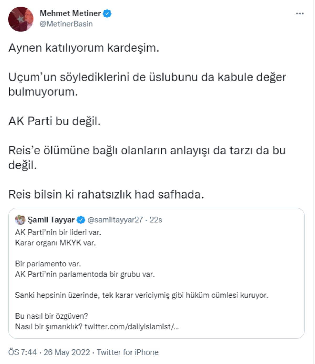 Metiner, "Uçum’un söylediklerini de üslubunu da kabule değer bulmuyorum. AK Parti bu değil. Reis’e ölümüne bağlı olanların anlayışı da tarzı da bu değil. Reis bilsin ki rahatsızlık had safhada" ifadelerine yer verdi.